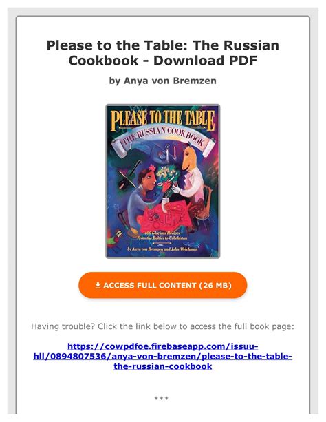 Due to the recent pandemic Corona virus, several universities decide to take on line lessons at your home. Then electronic textbooks are important for many students. In this situation, you'll be able to down load the PDF textbook. Utilizing e-books is not only environmentally friendly but in addition will save your hard earned money. In this write-up, We'll suggest you this Internet website to download an array of Please To The Table: The Russian Cookbook By Anya Von e-books totally free.